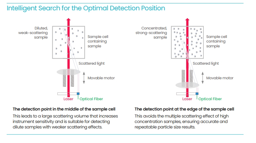 There is no single “best” scattering angle, only the most suitable one for a given sample. A 173° backscattering geometry offers superior sensitivity for weakly scattering nanoparticles. Because detection occurs close to the incident beam, it reduces multiple scattering and allows measurement at higher concentrations without excessive signal loss. This configuration also improves the signal-to-noise ratio, particularly for small particles and turbid dispersions.