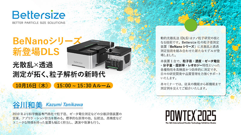 なお、POWTEX期間製品技術説明会にて、最新のDLS BeNanoシリーズをご紹介いたします。本シリーズは光散乱と透過測定を組み合わせたことで、粒子径、濃度、ゼータ電位、分子量、屈折率、レオロジー特性など、多様な物性評価を1台で高精度かつ効率的に実現します。ナノ粒子分析の新たな可能性を切り拓く本製品の特長や、様々な業界での活用事例について詳しくご紹介いたしますので、ぜひご参加ください。