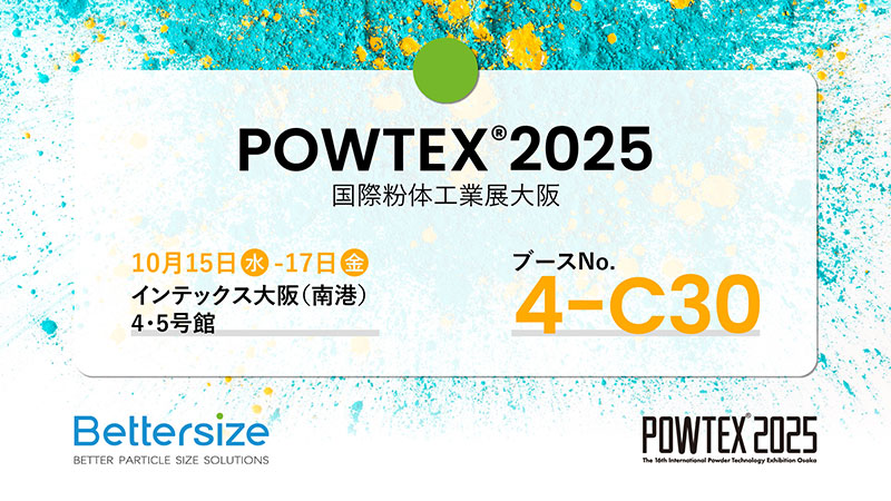 ベターサイズ・インスツルメンツ社(Bettersize Instruments)は、「第16回国際粉体工業展 大阪(POWTEX 2025)」へ出展いたします!本展示会は、2025年10月15日(水)~17日(金)の3日間、インテックス大阪にて開催されます。粉体技術の発展を目指し、世界中の業界リーダー、研究者、技術者が一堂に会する本展示会にて、ベターサイズ・インスツルメンツ社は最新の粒子径・形状・粉体物性の解析技術をご紹介いたします。