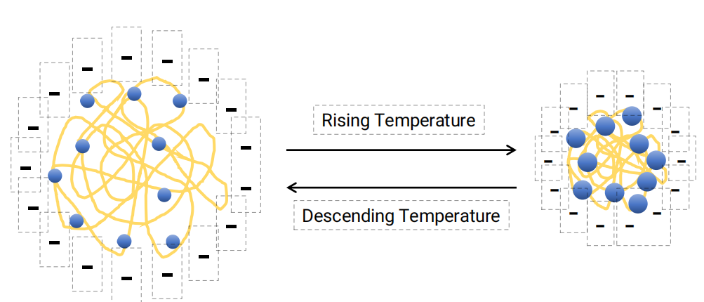 PNIPAm, Poly(N-isopropyl acrylamide), is a thermal sensitive polymer, which has been extensively studied since the 1990s. Due to the characteristics of its molecular structure, PNIPAm shows a phase transition corresponding to temperature variation. When the temperature exceeds its low critical solution temperature (LCST), the polymer chains gradually shrink to a collapsed conformation because of hydrogen bond interaction and hydrophobic effect. Interestingly, either compounded or copolymerized with other materials, the thermal sensitive property of PNIPAm molecules can be effectively maintained, and the phase transition behavior is reversible. Such a thermal sensitive characteristic is promising for many applications in pharmaceuticals and smart materials design.