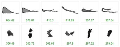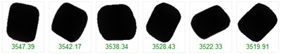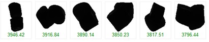 Figures 3-5 provide representative images of: adhered particles (XA > 3700 μm), normal particles (2000 μm < XA < 3700 μm), and impurity particles (XA <700 μm), respectively.