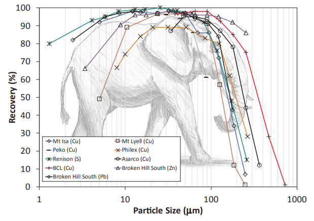 In conventional sulfide flotation systems, the relationship between particle size and recovery is commonly illustrated by the well-known “elephant curve”, as shown in Figure 4. This characteristic trend, higher recovery at intermediate particles sizes and lower recovery at both the fine and coarse ends, has remained largely unchanged over decades of industrial practice.[4]