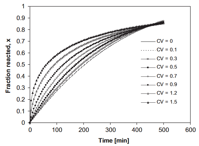 Figure 5. Particle size distributions at varying CV values and fraction reacted curves as a function of time.