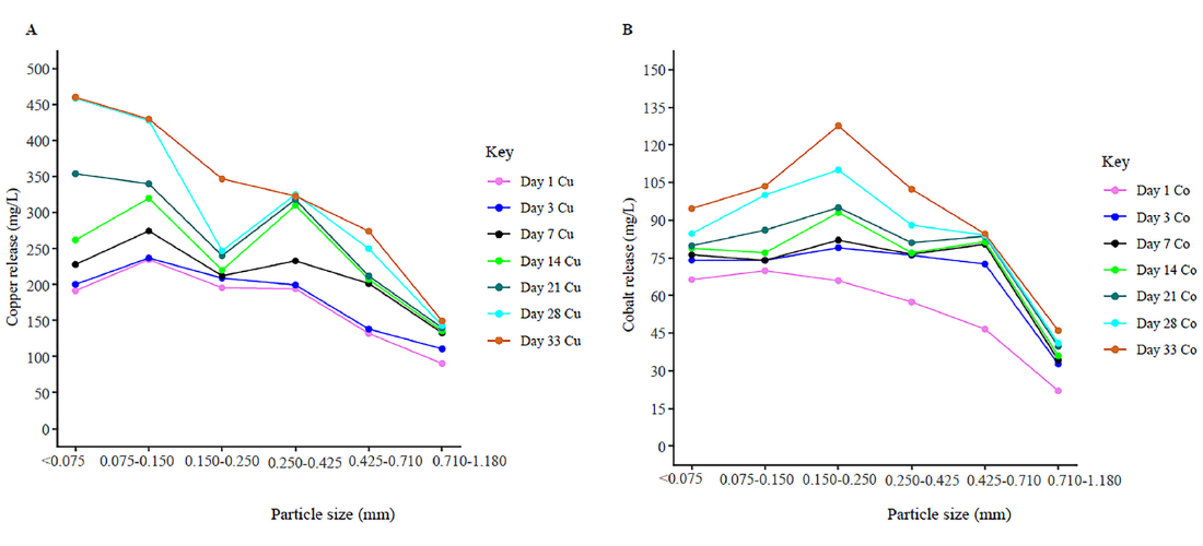 Particle size is a critical factor in assessing and managing the environmental risk associated with tailings storage. Fine particles consistently exhibit higher metal release, whereas coarse fractions generally show significantly lower release rates As illustrated in Figure 6, both Cu and Co release display a stronge size dependency: fine fractions release substantially more metal, while coarser fractions release markedly less. This trend indicates that the environmental behaviour of tailings, particularly metal mobility and leaching risk, is largely governed by the fine end of the PSD.[6]