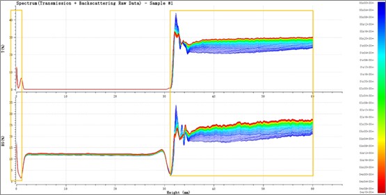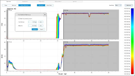 In the BeScan software, signals from non-sample regions—specifically the bottom of the vial and the area above the liquid (including the meniscus)—should be are excluded from analysis to avoid interference, as shown: